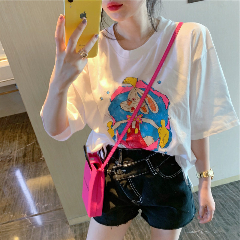 可昕家 2021夏季新品韩国东大米色卡通荧光小兔子圆领短袖T恤女热门设计联盟服务商